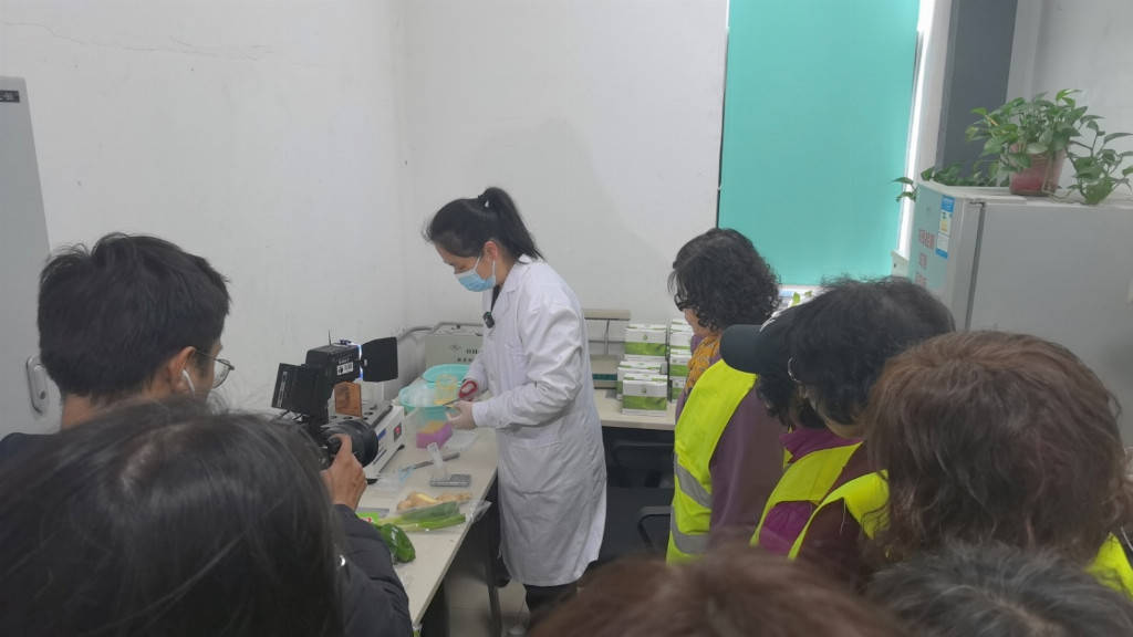 现场体验农残快检等专业流程,商品及格率达到 98.57%。